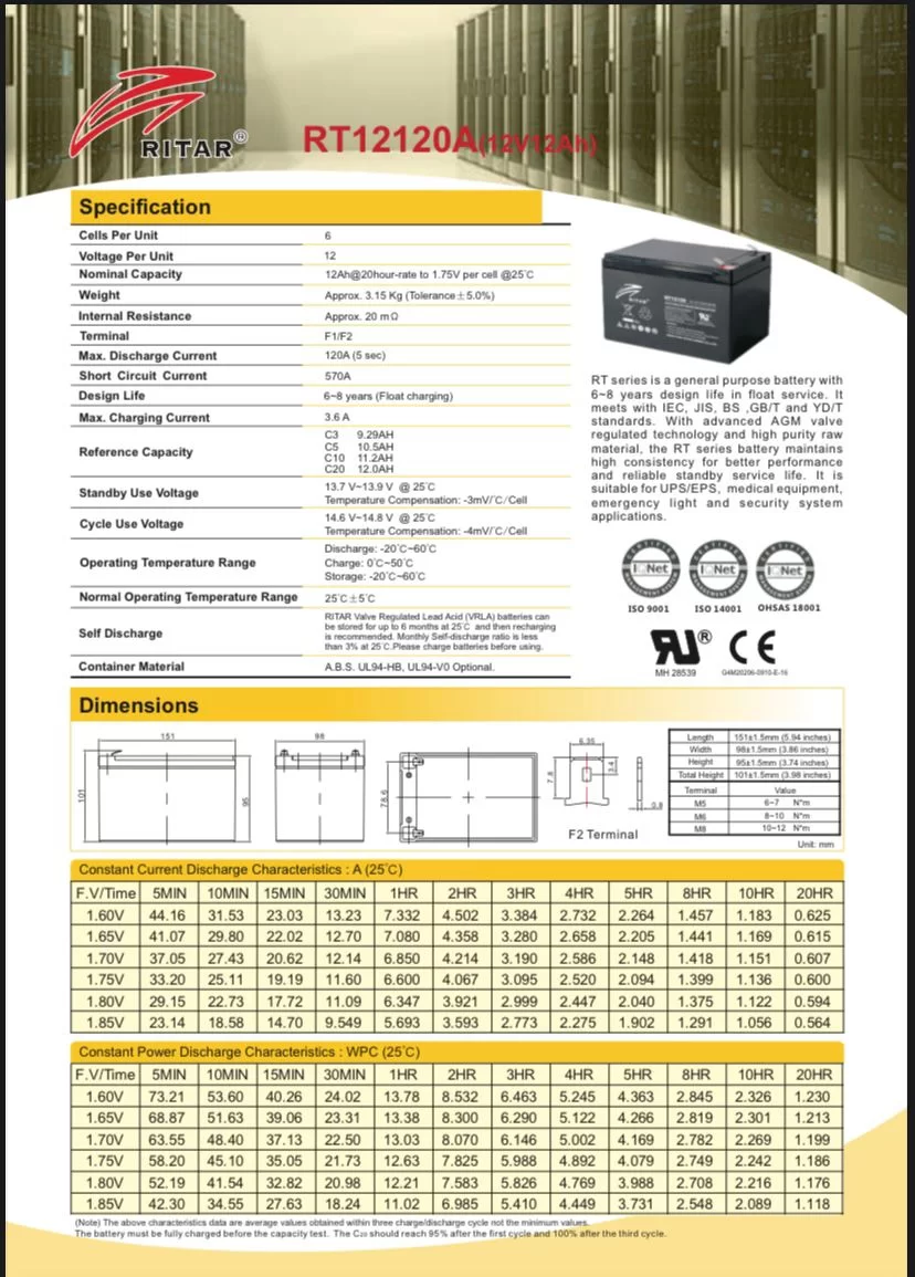 Brand: Ritar Power Capacity: 65AH Input Voltage : 12V Output Voltage: 12V Warranty : 1 Year , Design Life 6,8 Years