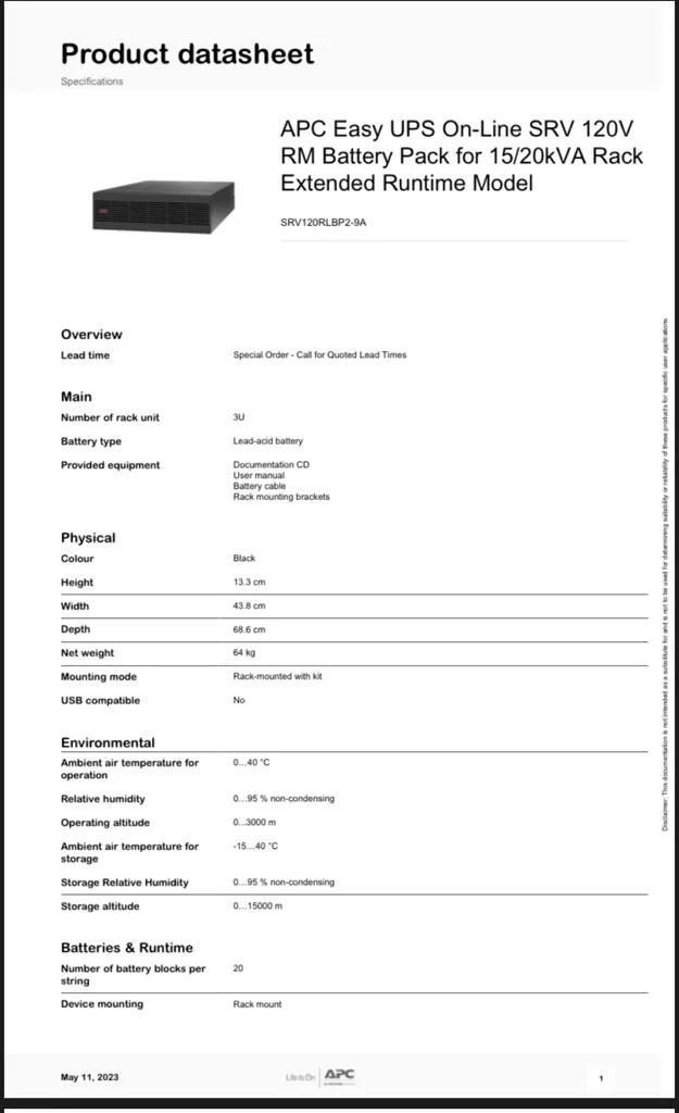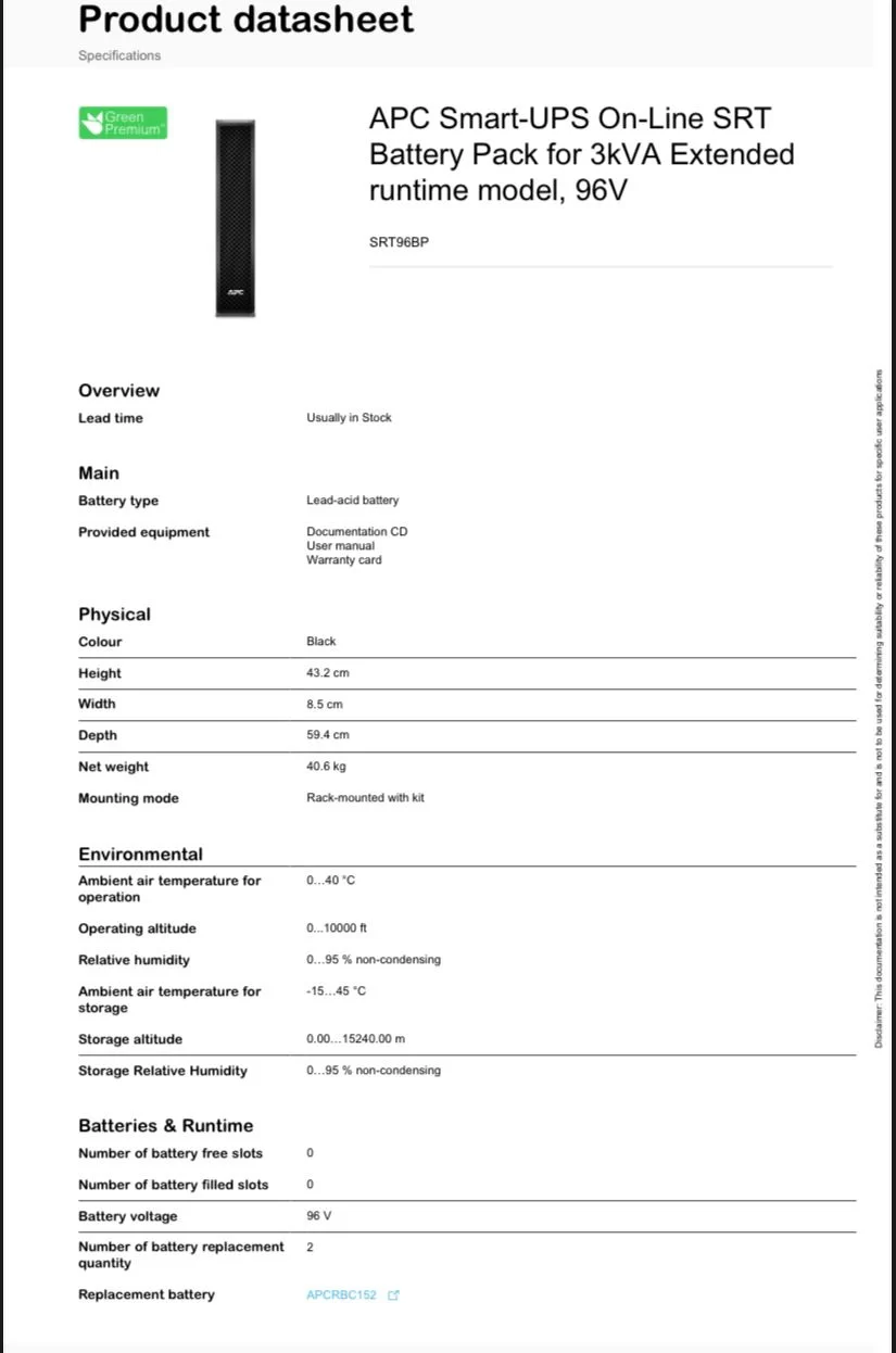SRV240RLBP-SRV240RLBP-9AAPC Easy UPS On-Line SRV Battery Pack (5/6kVA) for Standard Runtime Model 192V. 1344VAh. rackmount with kit. 2U