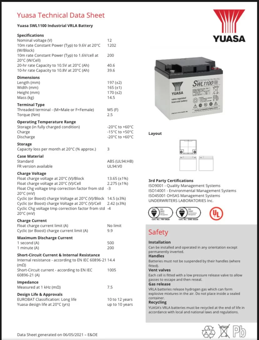 SWL1100 Yuasa Battery 12V 40AH