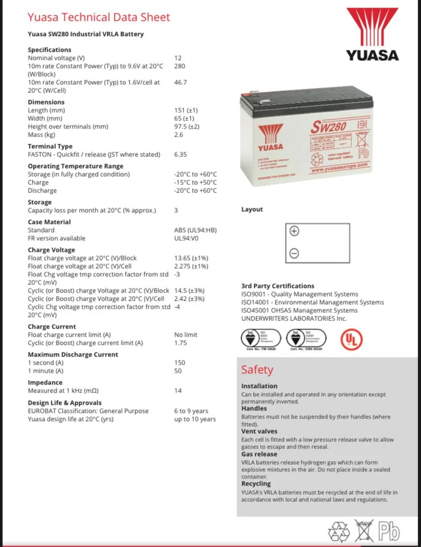 SW280 Yuasa Battery 12V 9A